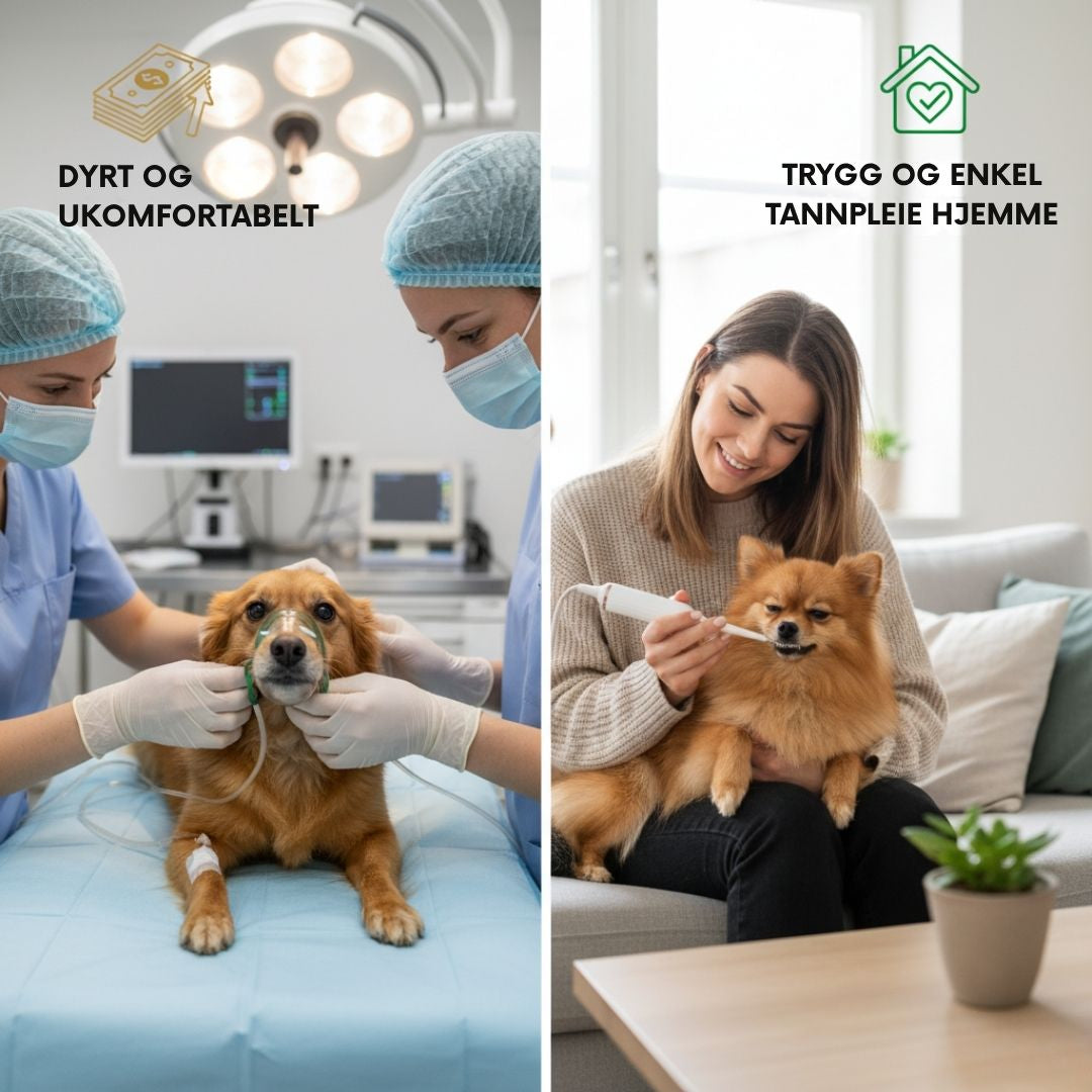 På bare noen få minutter i uken kan du gi hunden din den samme tannpleien som hos veterinæren – uten stress, risiko eller dyre regninger.